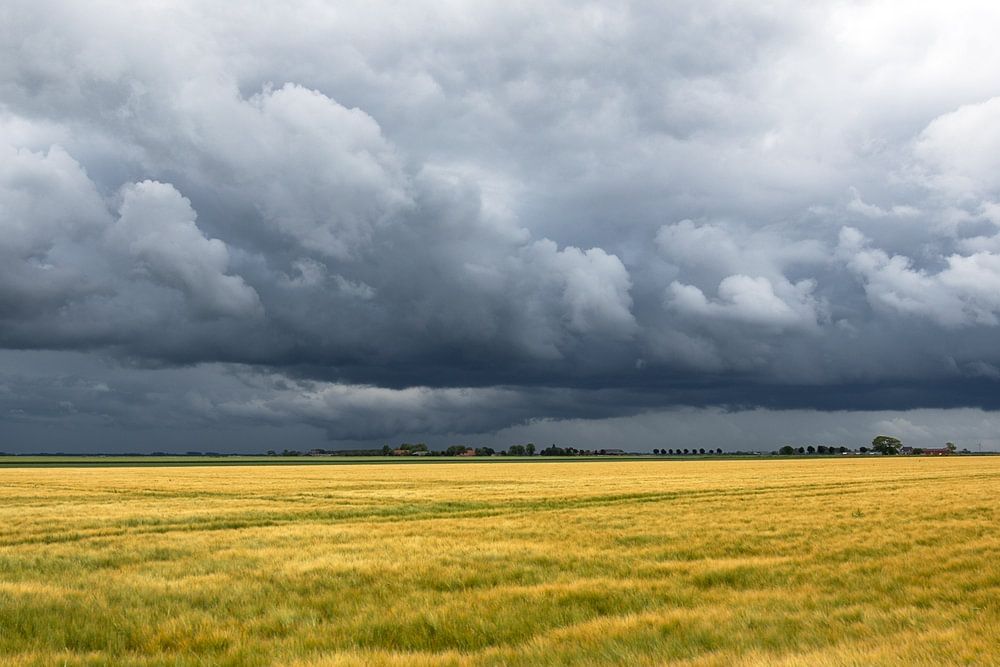 Schon bald sehen wir ein schönes Wolkenfeld, das über das noch niedrige Getreide zieht. Die Wolken sind sehr kontrastreich und machen das Bild bedrohlich und spannend. Wir stellen uns in angemessener Entfernung auf, um eine gute Aufnahme des Himmels zu machen. Es entsteht ein schöner Kontrast zwischen dem Himmel und dem Getreide.