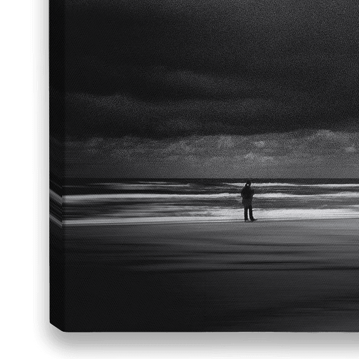 Da ist ein Mensch, der allein am Strand spazieren geht. Bedrohliche Wolken sammeln sich über der Nordsee. Dieser Moment findet auf Terschelling statt. Eine Watteninsel im Norden der Niederlande.