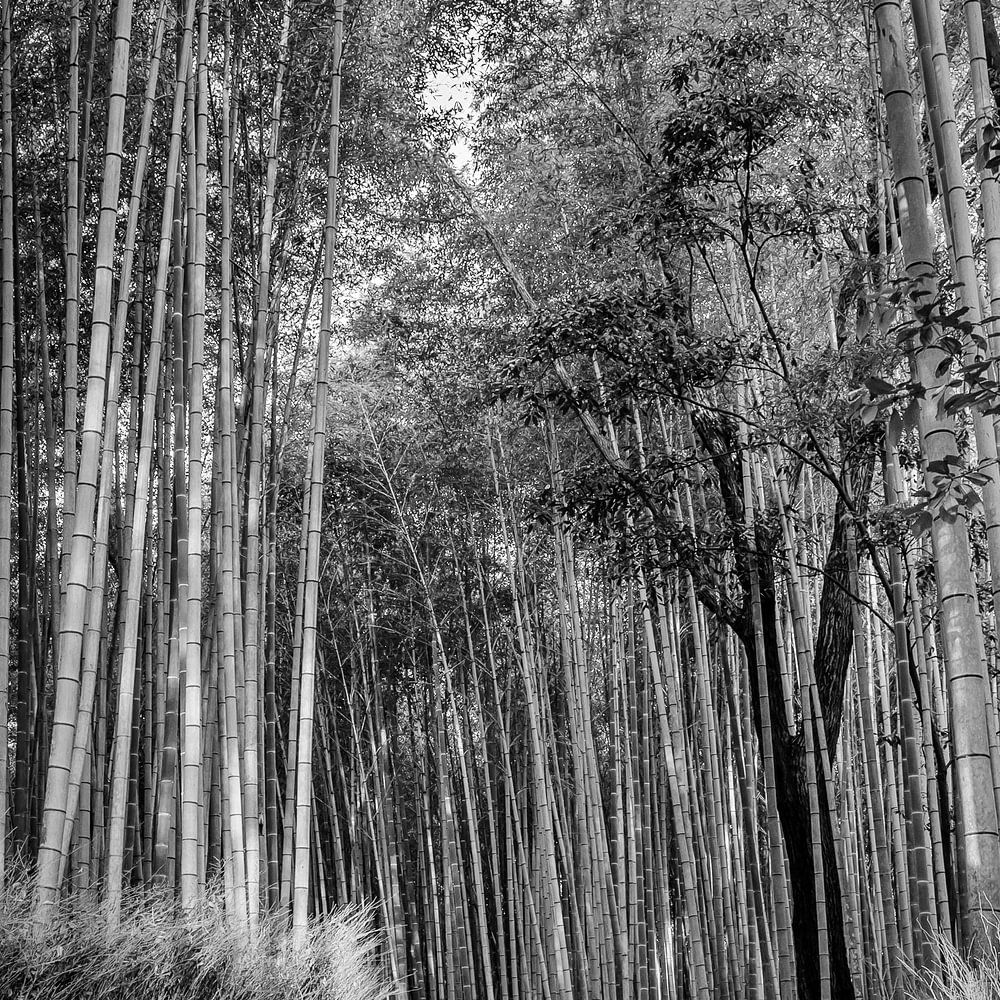 Der Arashiyama-Bambuswald ist eine der beeindruckendsten Sehenswürdigkeiten in Kyoto. Wenn man durch den Bambuswald wandert, fühlt es sich an, als ob man in eine andere Welt eintaucht. Die hohen Bambusstämme ragen hoch in den Himmel und bilden ein undurchdringliches Dach aus grünen Blättern über einem schmalen Pfad. Das Spiel von Licht und Schatten, das durch die dichten Bambusstämme entsteht, verleiht der Umgebung eine geheimnisvolle und faszinierende Stimmung. Der Arashiyama-Bambuswald ist nicht nur ein visuelles Spektakel, sondern auch ein Ort der Ruhe und Meditation. Das sanfte Rascheln der Bambusblätter im Wind erzeugt eine beruhigende Geräuschkulisse, die Besucher dazu einlädt, die Hektik des Alltags hinter sich zu lassen und in die natürliche Schönheit ihrer Umgebung einzutauchen. Klassische Schwarz-Weiß-Impression.