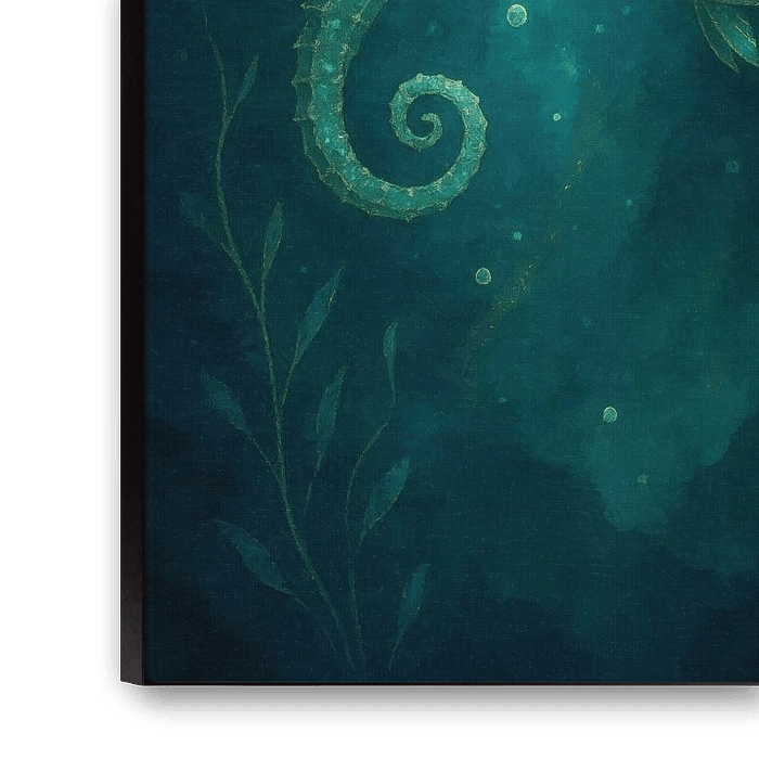 In „Begegnung im Blau“ treffen sich Seepferdchen und Fisch in einem stillen Dialog unter Wasser – ein Moment voller Anmut und Geheimnis. Die feinen Details, die organischen Formen und die tiefen Blau- und Grüntöne verleihen dem Bild eine meditative Kraft. Dieses Wandbild lädt zum Innehalten ein und bringt die Magie der kleinen Begegnungen in den Fokus – ideal für Räume, die Ruhe, Achtsamkeit und Naturverbundenheit ausstrahlen.