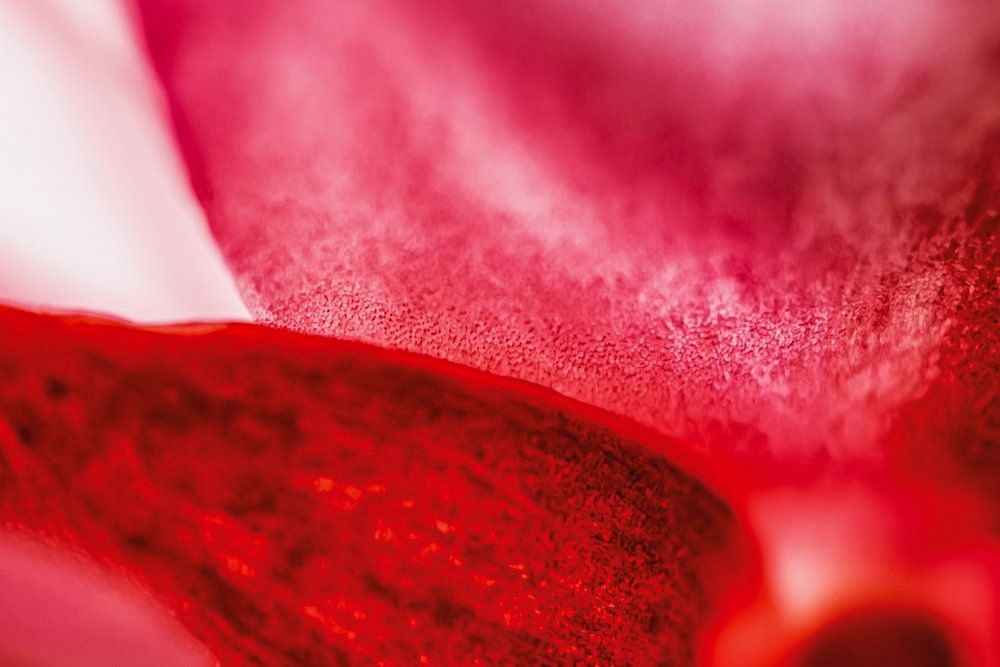 Makrofotografie einer Begonien-Blüte. Die Blüte wurde von unten gegen das Sonnenlicht fotografiert. So sieht man wunderbar die verschiedenen Pink- und Rottöne.