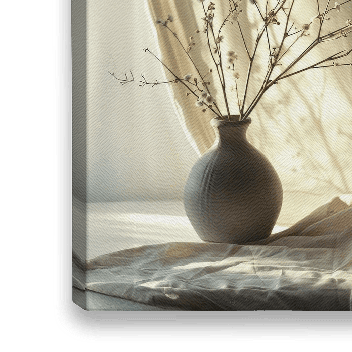 Bestelle dieses Blumen-Wandbild Beigefarbene Vase mit Zweigen von Kaiori Oldenburg als Reproduktion auf Leinwand, Alu-Dibond, als Poster, Fototapete oder Acrylglasbild.