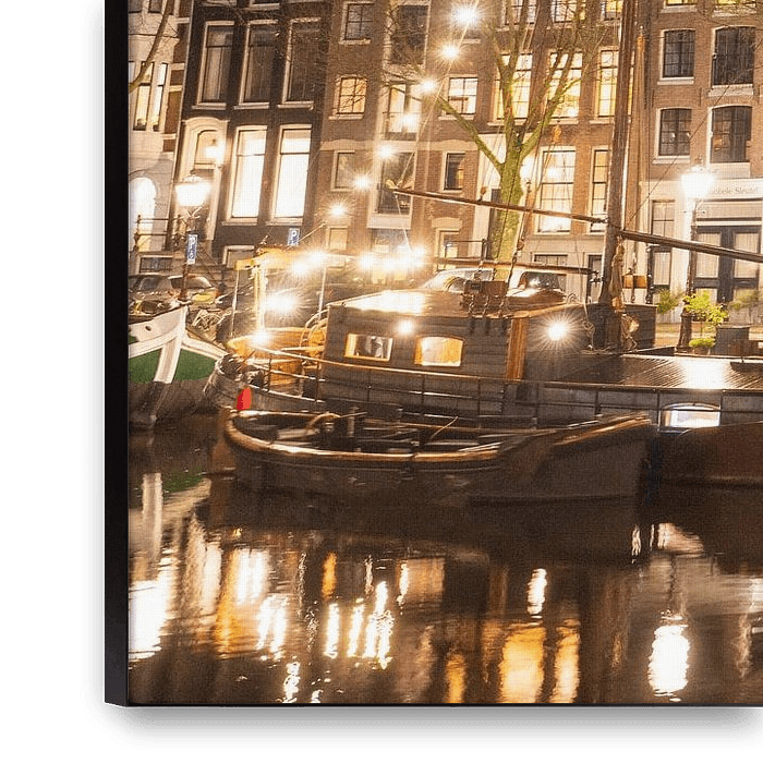 Bestelle das Foto Beleuchtetes Amsterdamer Segelboot in der Grachtengegend der Innenstadt von Sjoerd van der Wal Fotografie als Reproduktion auf Leinwand, Alu-Dibond, als Poster, Fototapete oder Acrylglasbild.