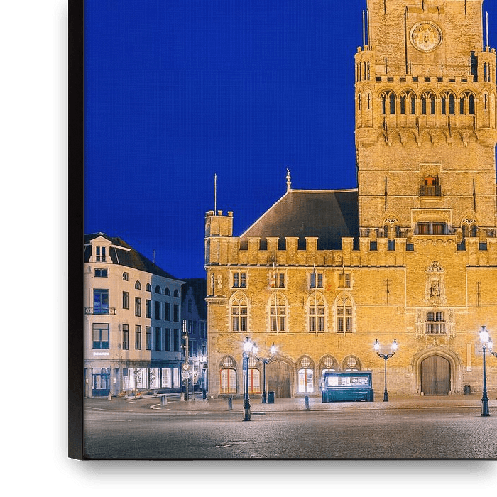 Nach Sonnenuntergang und während der blauen Stunde, der Belfried von Brügge, ein mittelalterlicher Glockenturm im historischen Stadtzentrum von Brügge, Flandern, Belgien.