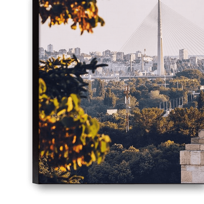 Im Hintergrund erhebt sich der 200 Meter hohe Pylon der Brücke über die Ada Ciganlija, die seit 2011 den Fluß Save überquert.
