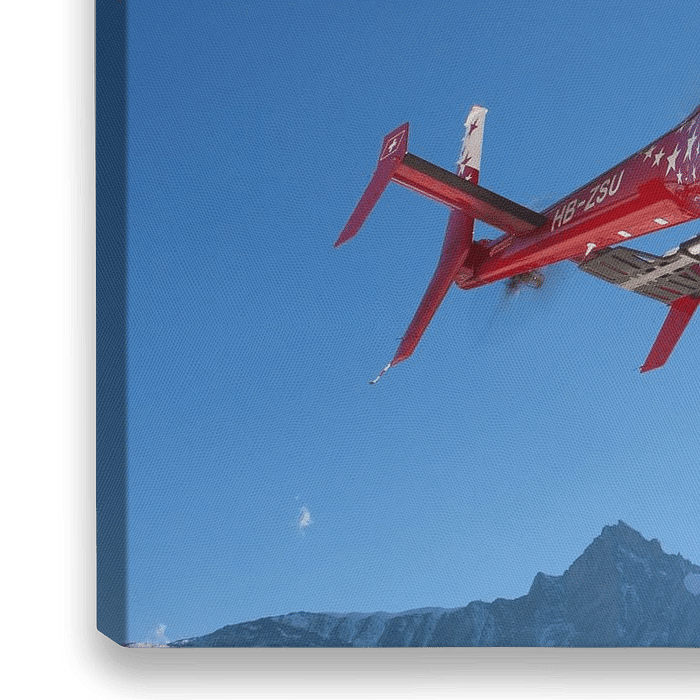 Susi, ein Bell 429 Rettungshubschrauber der Air Zermatt, dem Rettungsdienst in Wallis, Schweiz. Die Sonne, die in das Objektiv scheint, macht das Bild kraftvoll. Ein Bergretter ist bereit, zu einem verwundeten Alpinisten an der Winde abzusteigen.
