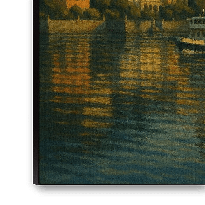 Dieses Gemälde eignet sich perfekt für ruhige Räume, Häuser am Wasser oder für Sammler von filmischem Realismus. Es destilliert den Geist von Como in reine visuelle Poesie - golden, zeitlos und unendlich ruhig.