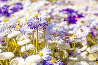 Das Bild zeigt ein dichtes Feld von Gänseblümchen (Bellis perennis), deren Blütenköpfe überwiegend weiß mit gelben Zentren erscheinen. Einige Blüten weisen auffällige violette Verfärbungen an den Blütenblättern auf – ein Hinweis auf die bewusste farbliche Verfremdung des Bildmaterials. Diese künstlerische Bearbeitung hebt die natürliche…