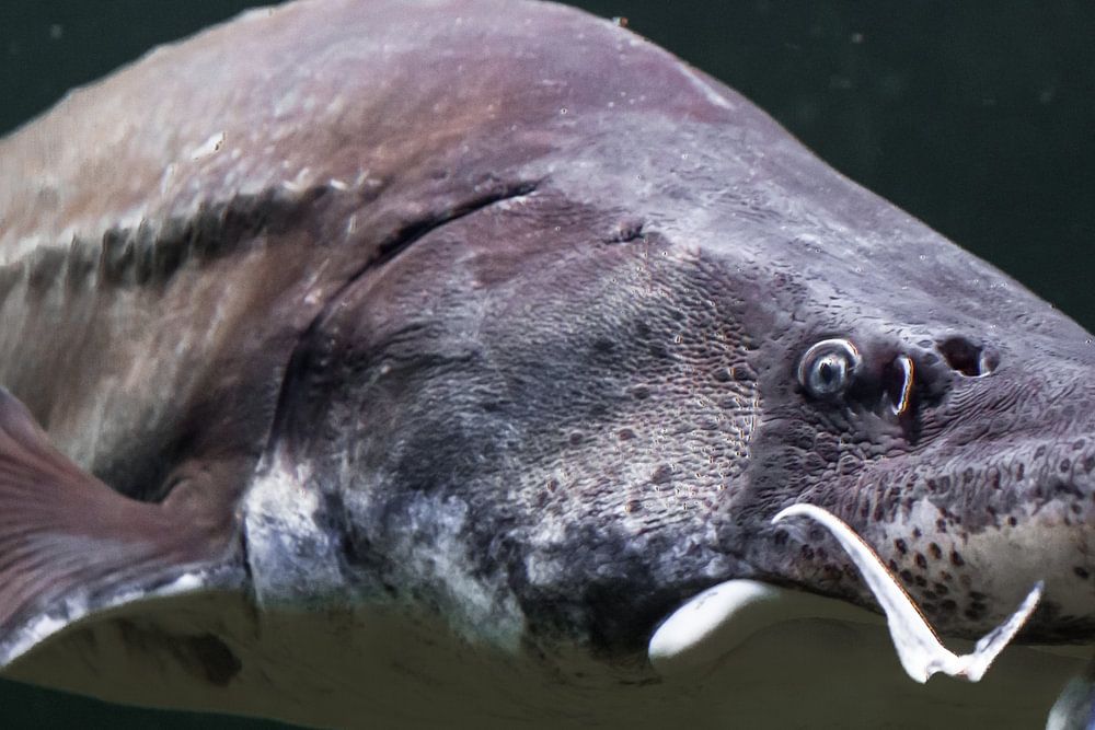Beluga Fisch Stör Fisch Nahaufnahme Schnauze mit einem Schnurrbart taucht aus dem dunkelgrünen Wasser.