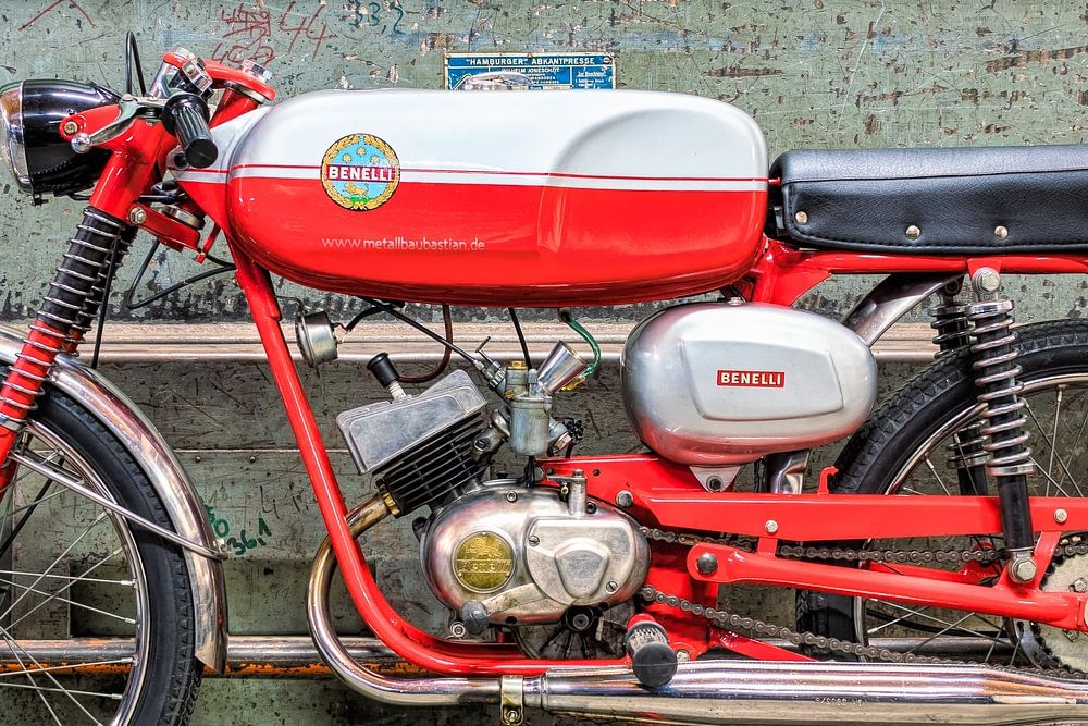 Eine Benelli 50 Straßenmaschine aus Italien vor einer Abkanntpresse in einer Metallwerkstatt.