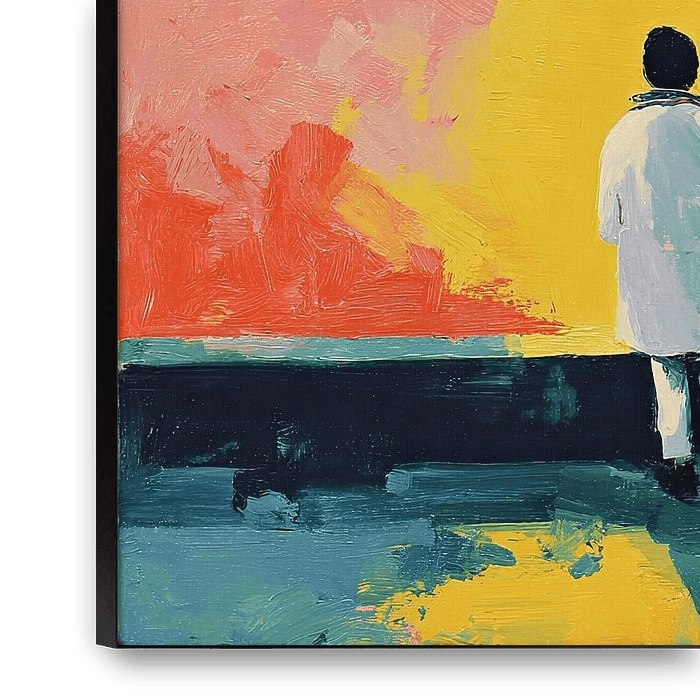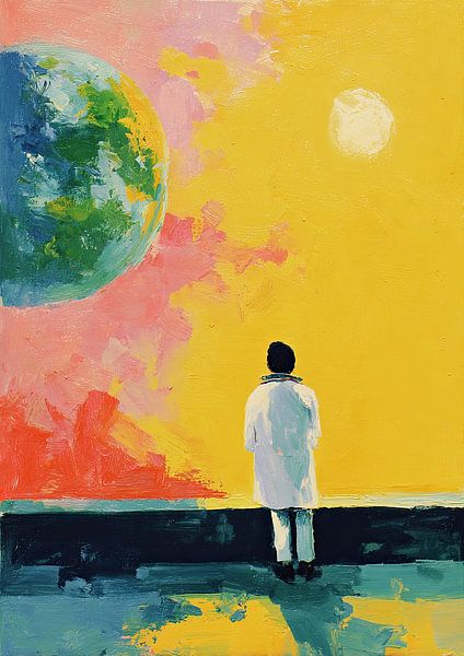 Dieses ausdrucksstarke, stilisierte Gemälde wird von einem strahlend gelben Hintergrund dominiert, der auf der linken Seite in sanfte Pink- und Orangetöne übergeht. Im oberen linken Bereich schwebt die Erde, abstrakt und doch greifbar in Blau, Grün und Weiß gerahmt, während eine große weiße Kreisscheibe – wie eine ferne Sonne oder ein…