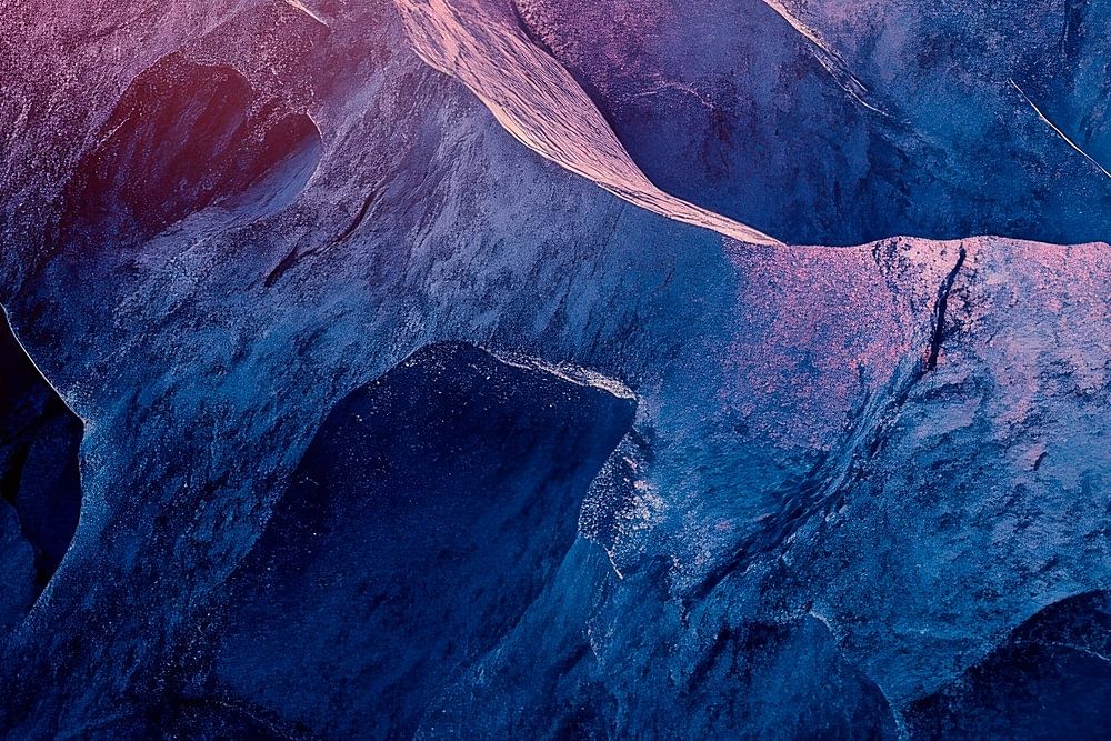Sanfte Lichtakzente tanzen über kraftvolle, wellenförmige Strukturen, die an eine mystische Landschaft erinnern. Die tiefen Blau- und Lilatöne verleihen dem Raum eine beruhigende Atmosphäre und laden zum Träumen ein. Perfekt für das Schlafzimmer, wo sie eine entspannende Oase der Ruhe schafft und zum Verweilen einlädt.