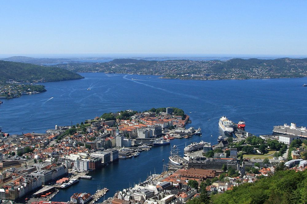 Met een kleine trein kom je in Bergen de steile helling van de Floyen omhoog waarna een mooi uitzicht over Bergen wordt gepresenteerd. De natste stad van Europa lag die dag onder een strak blauwe lucht.... Op de achtergrond het cruiseschip MS Koningsdam van de Holland America Line