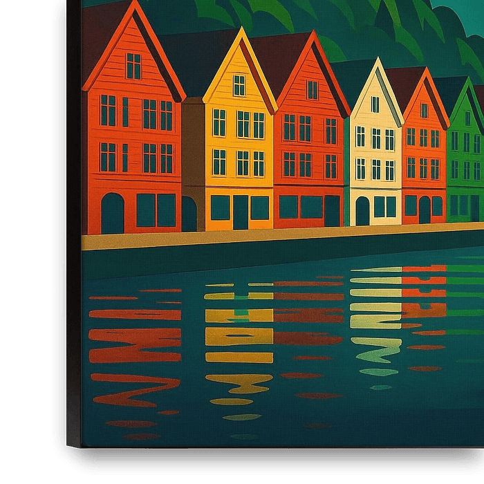 Holen Sie sich die Schönheit der norwegischen Stadt Bergen mit diesem von der Art déco inspirierten Reiseposter in Ihr Zuhause. Das Motiv zeigt die berühmten bunten Holzhäuser von Bryggen vor einer dramatischen Berglandschaft und fängt den einzigartigen Charme der berühmten norwegischen Küstenstadt ein. Goldene Lichtstrahlen beleuchten…