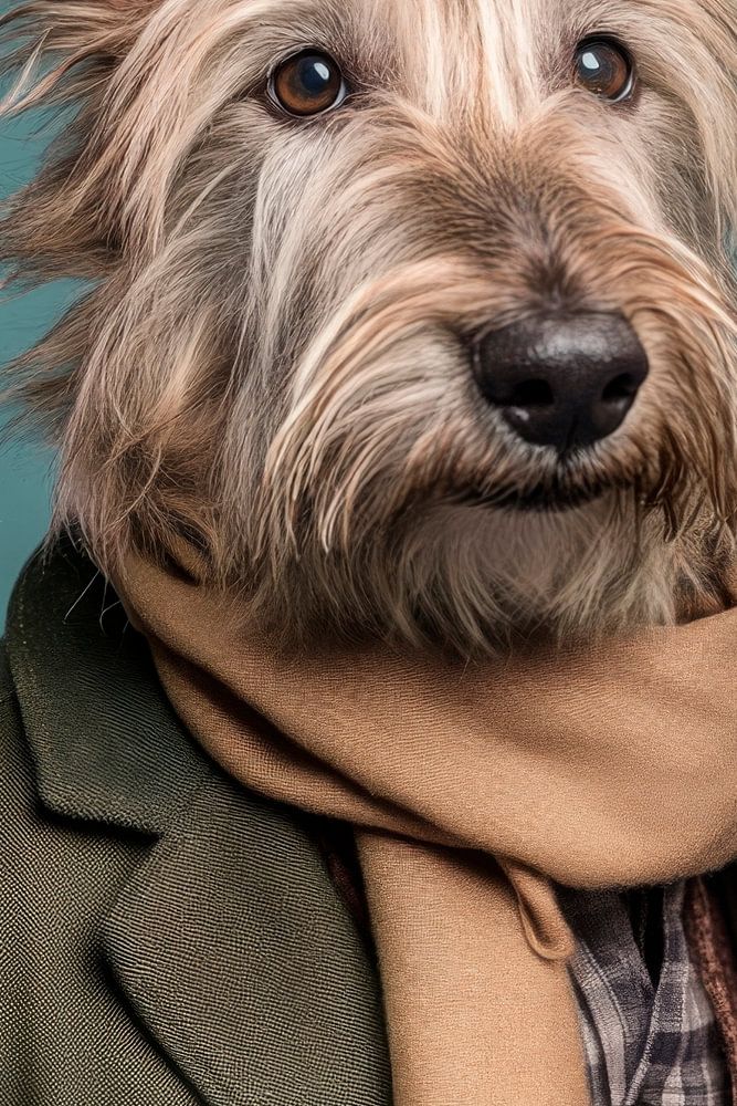 Mit eleganter Haltung und einem Hauch von Geheimnis strahlt dieser Berger Picard Charme und Charakter aus. Sein strubbeliges, goldbraunes Fell und die aufmerksamen, spitzen Ohren verleihen ihm ein quirliges Aussehen. Eingekleidet in einen modischen Mantel und mit einem schicken Schal, erzählt er Geschichten von Abenteuern und Freundschaft, bereit die Welt zu erkunden.