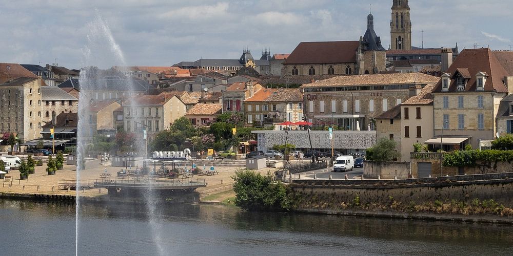 Die pulsierende Skyline von Bergerac ist in diesem Panoramabild eingefangen, mit dem ruhigen Fluss Dordogne und den eleganten Gebäuden der Altstadt, die einen schönen Blick von der alten Brücke (vieux pont) bieten. Schönes Souvenirbild dieser charmanten Stadt in der Region Perigord in der Nouvelle-Aquitaine in Südfrankreich.