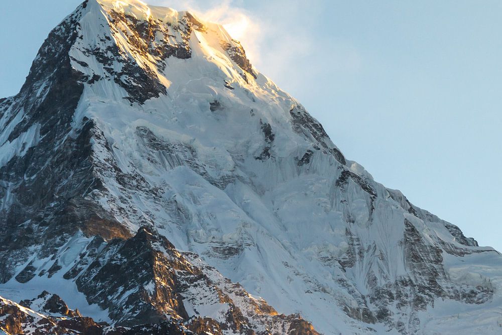 Berggipfel am Morgen am Poon Hill im Annpurna-Gebirge in Nepal. Das Sonnenlicht strahlt goldenes Licht auf den Berg.