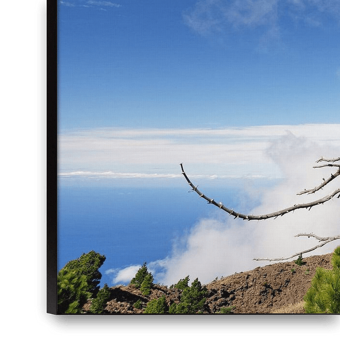Auf einem hohen Bergkamm steht ein malerischer vertrockneter Baum, darüber blauer Himmel mit wenigen markanten weißen Wolken, Ausblick auf das Meer - Location: Spanien, Kanarische Inseln, La Palma