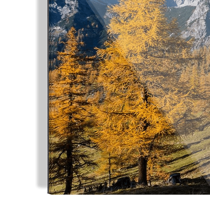 Am Fuße der imposanten Dachstein-Südwand stehen mehrere kleine Almhütten. Der Herbst hat schon Eintritt gehalten; die Lärche sind gelb verfärbt und der Himmel ist wolkenlos blau.