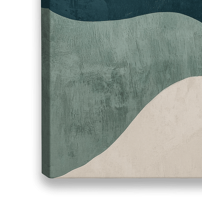 Sanfte Hügel in beruhigenden Blau- und Erdtönen entfalten eine harmonische Landschaft, die zum Träumen einlädt. Die fließenden Formen erinnern an einen entspannten Spaziergang durch die Natur. Ideal für das Schlafzimmer, schafft es eine ruhige Atmosphäre, die Entspannung und Wohlbefinden fördert. Ein perfekter Blickfang für ruhige…