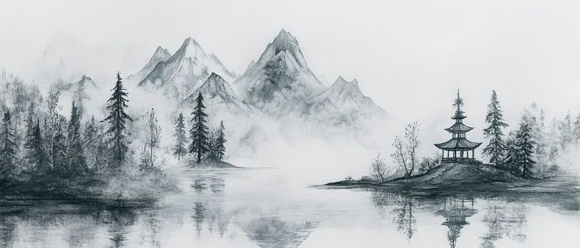 In sanften Grautönen entfaltet sich eine zauberhafte Landschaft, in der majestätische Berge und ein ruhiger See harmonisch miteinander verschmelzen. Der elegante Pavillon am Ufer spiegelt sich im Wasser und lädt zum Träumen ein. Dieses Kunstwerk eignet sich perfekt für das Schlafzimmer oder das Wohnzimmer, um eine beruhigende Atmosphäre…