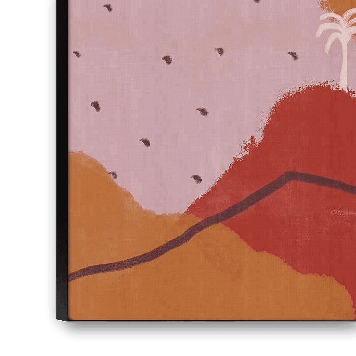 Bringen Sie Ruhe und Wärme in Ihr Interieur mit dieser einzigartigen Berglandschaft, die in einer harmonischen Palette aus warmen Farben und Pastelltönen ausgeführt ist. Tiefrote und ockerfarbene Berge fließen subtil mit sanften Pastellfarben wie Beige, Flieder und Pfirsichrosa zusammen. Das Gemälde strahlt eine minimalistische Eleganz aus, die Schlichtheit und Farbe perfekt ausbalanciert.