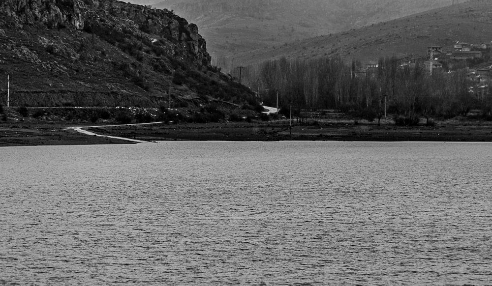 ein Schwarz-Weiß-Bild eines Stausees inmitten der nebligen Berge der Türkei