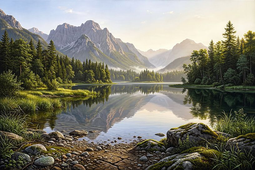 Bestelle diese Malerei Bergsee - Der Tag beginnt von Max Steinwald als Reproduktion auf Leinwand, Alu-Dibond, als Poster, Fototapete oder Acrylglasbild.