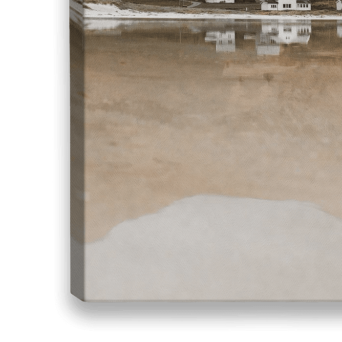 Ein schönes stehendes Bild von norwegischen Häusern an der Küste. Durch die Spiegelung kann man alles doppelt sehen, was es zu einem schönen Bild macht, das man sich ansehen kann.