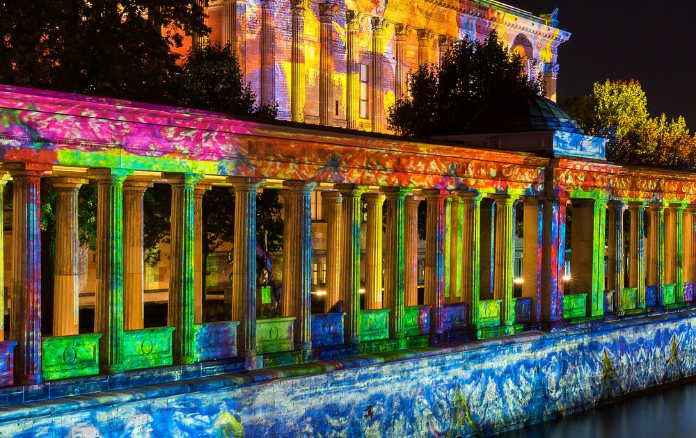 Berlin - Alte Nationalgalerie und Kolonnaden an der Spree in besonderem Licht, anlässlich eines Lichtfestes in der deutschen Hauptstadt