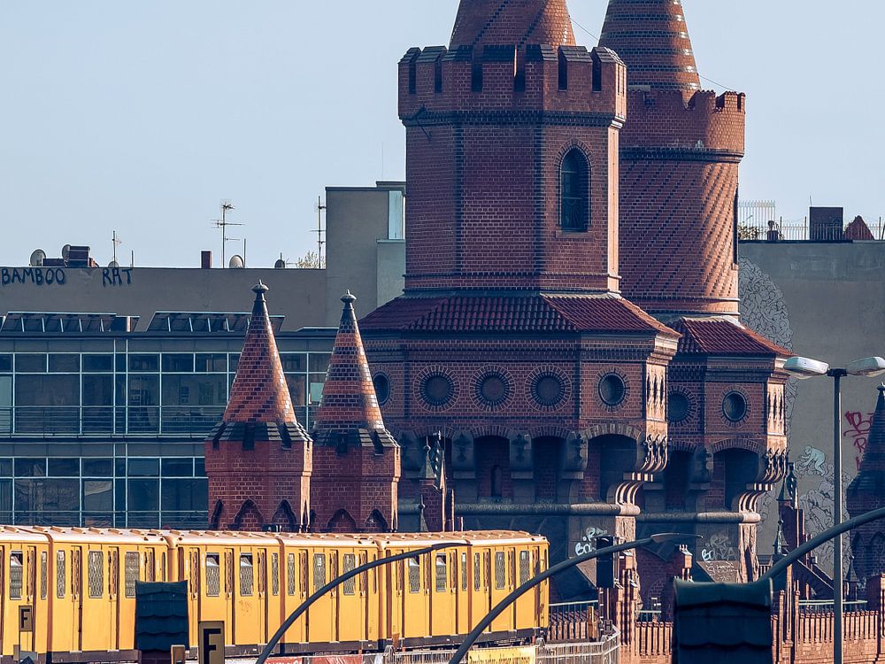 Ein Blick auf die Berliner Oberbaumbrücke und eine U-Bahn der Linie U1.