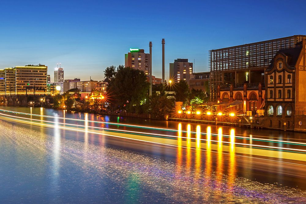 Berliner Skyline an der Spree mit Fernsehturm in der blauen Stunde