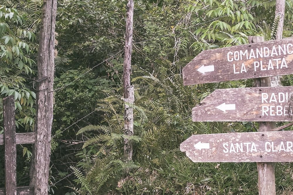 Dieses Foto zeigt einen der Wegweiser während einer Wanderung nach Comandancia de la Plata in den Bergen der Sierra Maestra in Kuba. Comandancia de la Plata sind die alten Lager von Fidel Castro und Che Guevara. Sie finden hier auch ein Feldlazarett, eine Frauenkaserne und ein kleines Museum.