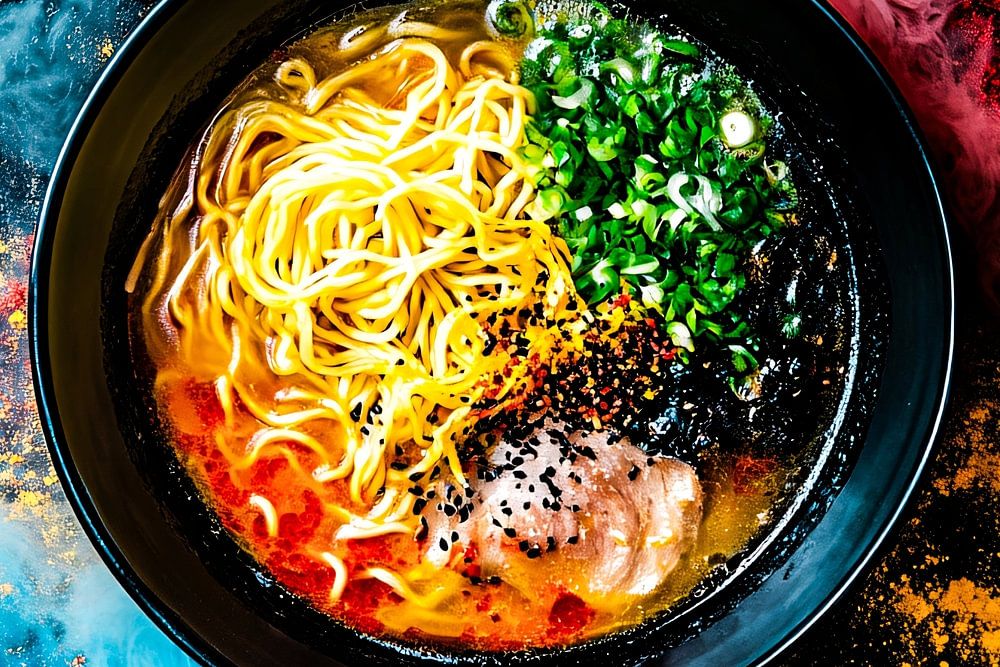 Dieses auffällige Design ist ein modernes künstlerisches Statement mit einer Mischung aus kulinarischer Kunst und leuchtenden Farben. Eine dampfende Schüssel mit Ramen, perfekt präsentiert, ist umgeben von einer Explosion von Farben und Rauch, die Bewegung und Energie ausstrahlen. Ideal für Liebhaber von kulinarischen Genüssen oder für Kunstsammler, die ihren Innenräumen Dynamik und Wärme verleihen wollen. Dieses Werk fängt die Essenz der modernen Ästhetik ein und passt perfekt in eine Küche oder ein Esszimmer, wo es für Gesprächsstoff sorgen wird.