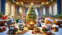 Eine gemütliche Weihnachtsszene entfaltet sich in diesem Bild, wo kleine Tier-Ritter in festlichem Schmuck versammelt sind. Die Ritter, darunter Hasen und ein Fuchs, tauschen Geschenke aus und genießen die Wärme des Kaminfeuers. Ein prächtiger Weihnachtsbaum steht im Zentrum, umgeben von leckeren Festtagsspeisen. Girlanden und Kerzen…