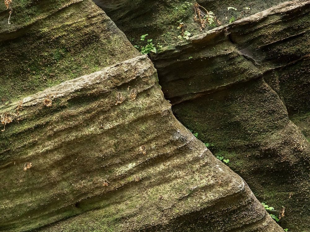 Verwitterung at its best. Ich mag diese massive grüne Wand sehr, das Über und Über Bewachsensein mit Moos, das Urige, das Lebendige. Ein Künstler hätte die Strukturen nicht besser herausarbeiten können. Die Natur mag vielleicht der größte Künstler sein.