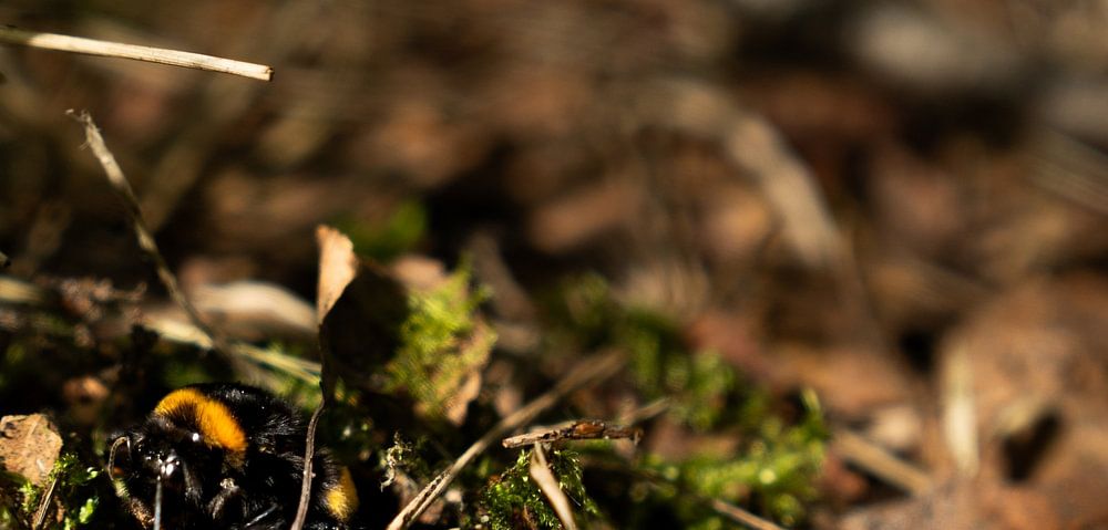 Eine Biene, die in der Erde zwischen Trockenheit und Moos mampft. So fokussiert, dass er die Kamera nicht gesehen hat.