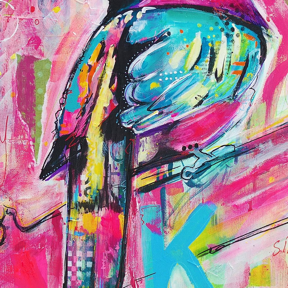 Die farbenfrohe Schichtung, die Verwendung von Acryl- und Mixed-Media-Hintergründen prägen meine Arbeit und meinen eigenen Stil.