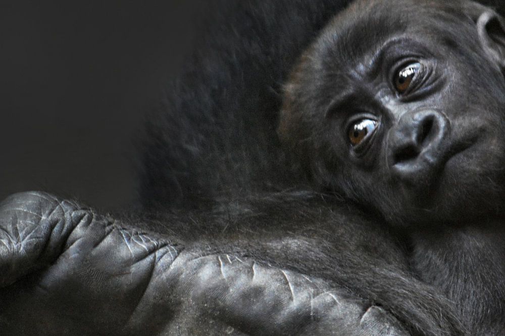 Gorillababy am Fuß der Mutter liegend