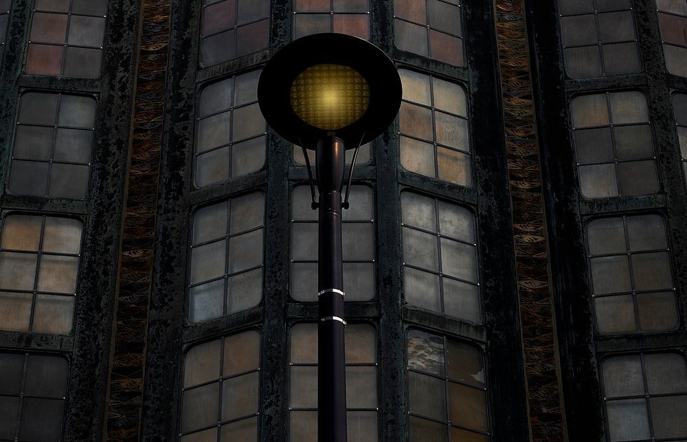 Eine Frontansicht des Bijenkorfs in Den Haag mit einem Leuchtturm im Vordergrund.