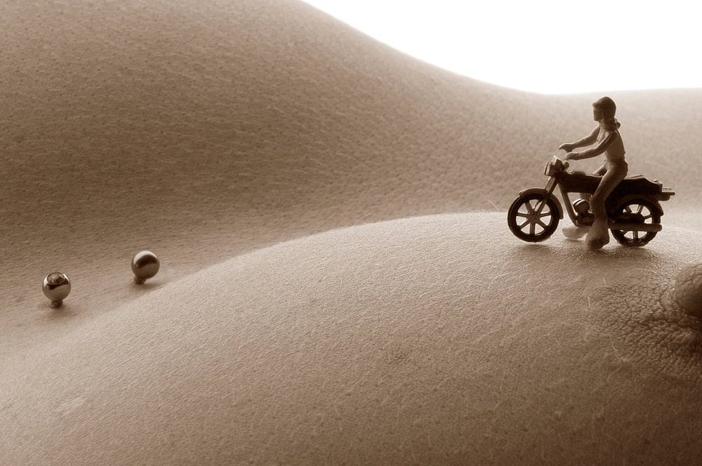 Ein kleiner Motorradfahrer in einer unwirklichen Landschaft zwischen den Brüsten einer nackten Frau.
