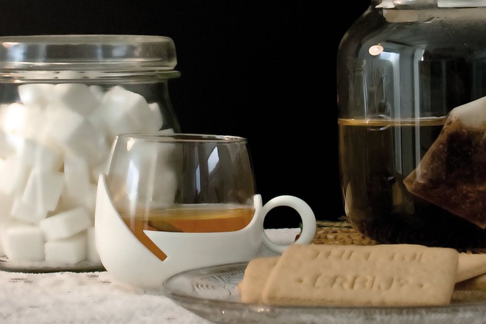 Foto eines Stillebens mit Tee und Keksen im Retrostil.