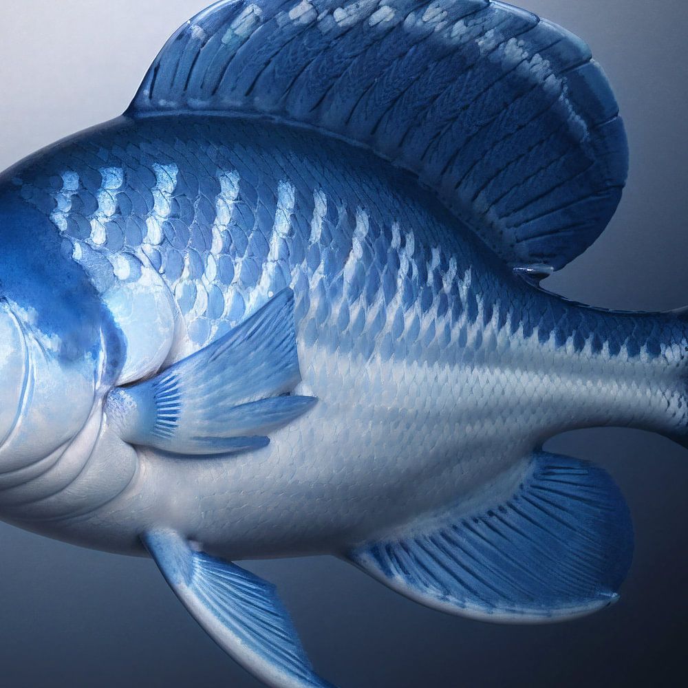 In den Tiefen eines nächtlichen Meeres funkelt ein wunderschöner Delfter Fisch, der von einem tiefen Blau in ein sanftes Glühen übergeht. Lassen Sie sich von der unaufdringlichen Pracht dieser künstlerischen Kreation verführen, einer Hommage an das Erbe und die Fantasie.