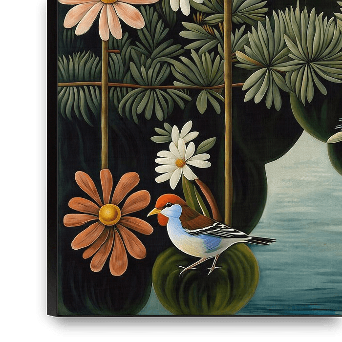 Das Bild 'Birdlake Heaven' aus der Serie 'Magical Landscapes' zeigt ein lebhaftes und ruhiges Wasserspiel, umgeben von üppiger tropischer Vegetation, bunten Blumen und exotischen Vögeln. Wie die anderen Bilder der Serie entführt auch dieses Gemälde in eine surreale Welt, in der die Natur auf magische Weise lebendig…