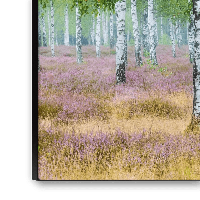 Bestelle dieses Landschafts-Wandbild Birkenwäldchen mit blühender Heide von Daniela Beyer als Reproduktion auf Leinwand, Alu-Dibond, als Poster, Fototapete oder Acrylglasbild.