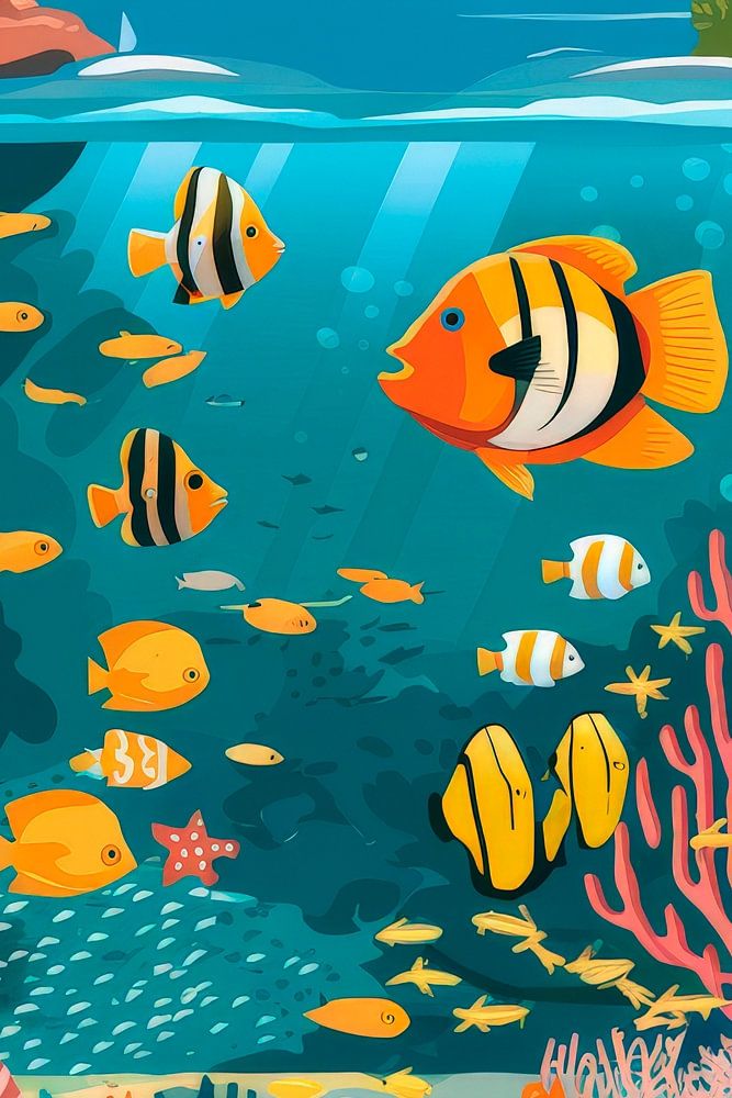 Ein faszinierendes Unterwasserparadies entfaltet sich in lebendigen Farben: bunte Fische tummeln sich zwischen leuchtend korallenfarbenen Riffen, während die Sonne sanft über der Wasseroberfläche strahlt. Dieses Bild ist eine perfekte Ergänzung für die Küche oder das Wohnzimmer, um eine entspannende, maritimen Atmosphäre zu schaffen und Träume von tropischen Abenteuern zu wecken.