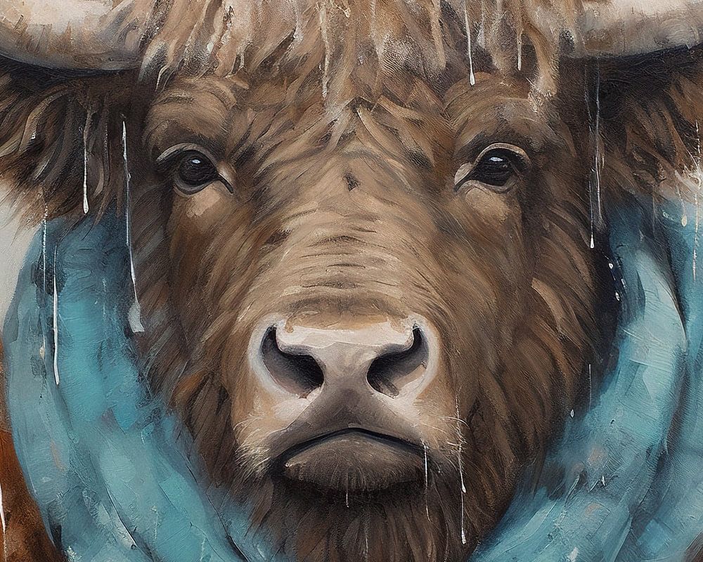 Bison im Pullover | Tierporträt - Dieses Kunstwerk zeigt einen realistisch gemalten Bison mit einem gestrickten orangefarbenen Pullover und einem blauen Schal, der eine humorvolle Wendung nimmt. Der Hintergrund ist schlicht und in einem ruhigen Grauton gehalten. Der ausdrucksstarke Blick des Bisons und die auffälligen Farben der Kleidung bilden einen reizvollen Kontrast zur Nüchternheit des Hintergrunds.