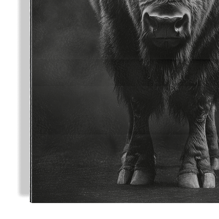 Stolz und majestätisch erhebt sich die kräftige Gestalt eines Büffels, seine mächtigen Hörner strahlen innere Stärke aus. In ausdrucksvollem Schwarz-Weiß fängt das Bild das raue, ungezähmte Wesen der Natur ein. Dieses Kunstwerk passt perfekt in ein Wohnzimmer oder Büro, wo es als kraftvolles Statement und Gesprächsanlass wirkt.