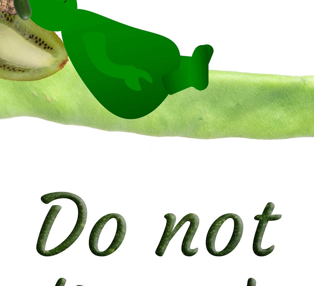 Cartoonfigur von Grüntyers, die auf einem Bett aus Bohnen und Kiwis einen gesunden Schlaf genießt. Schild "Bitte nicht stören
