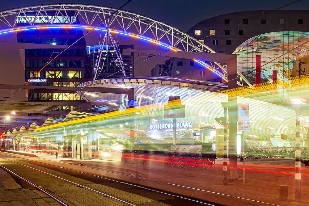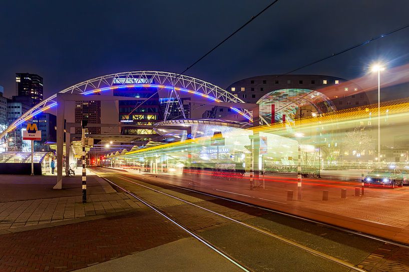 Abendimpression der Straßenbahn-, Metro- und Zugstation Blaak im Zentrum der Stadt Rotterdam. Eine Straßenbahn fährt in Richtung Oostplein ab. Dieses Foto wurde im Herbst 2015 aufgenommen.